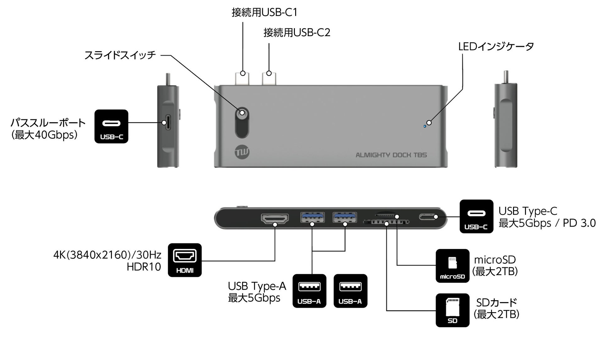 スライドスイッチ搭載の一体型USB-C ハブ! TUNEWEAR ALMIGHTY DOCK TB5