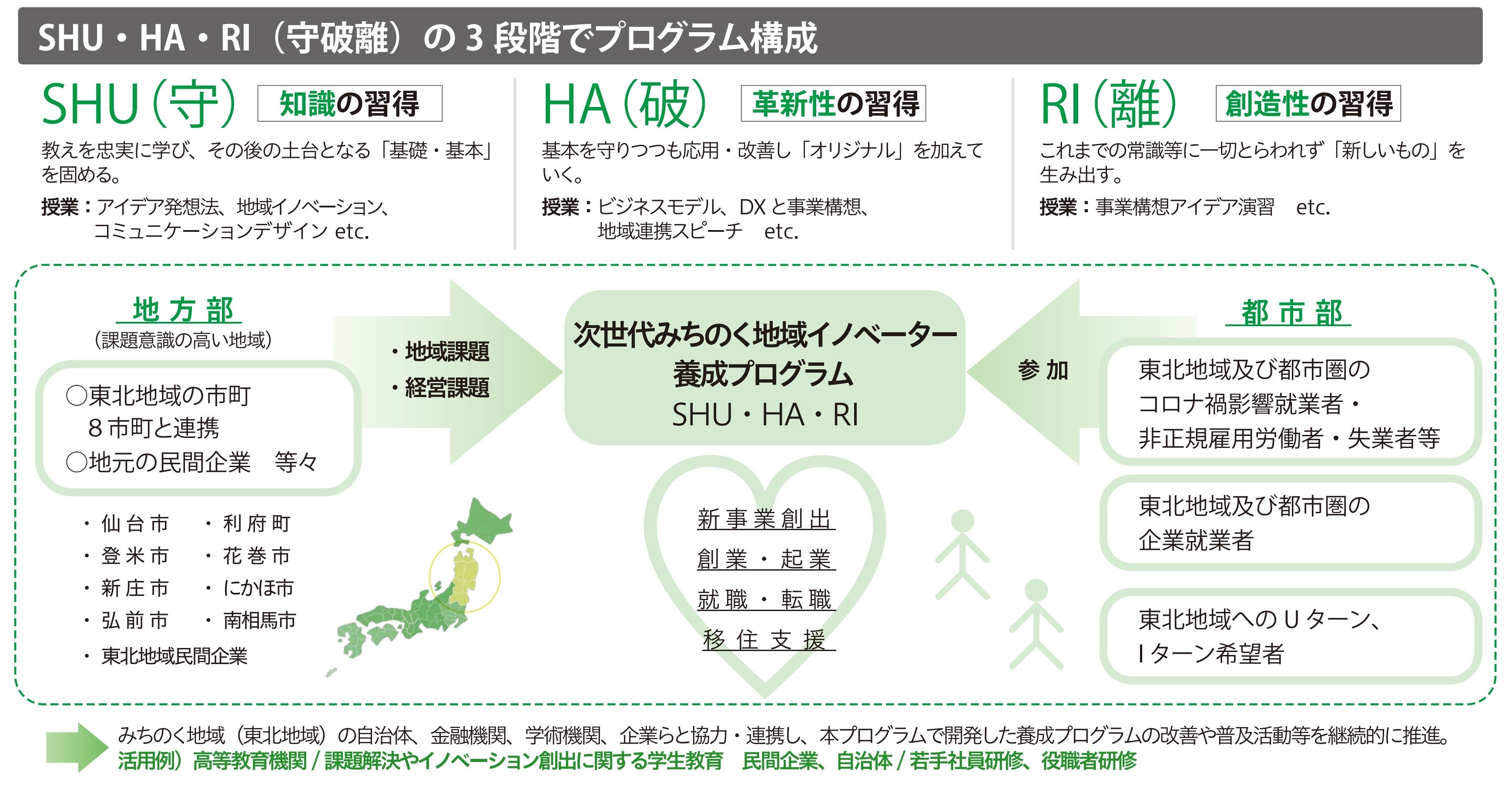東日本大震災から11年経ち、様々な支援により前向きに復興がすすむ中、まだ解決されていない課題が集積される東北地域。一方で、震災後、特に高速道路網が整備され首都圏との連結が飛躍的に高まり持続可能な交通ネットワークが構築されつつあること、また首都圏等に比べて地価や物価が安く、使用されていないテナントやスペース等の活用が容易であることなど魅力的な強みも光ります。これら地域資源を生かして可能性を広げ、みちのく地域に新たな価値を生み出す人材の台頭が、いま求められています。