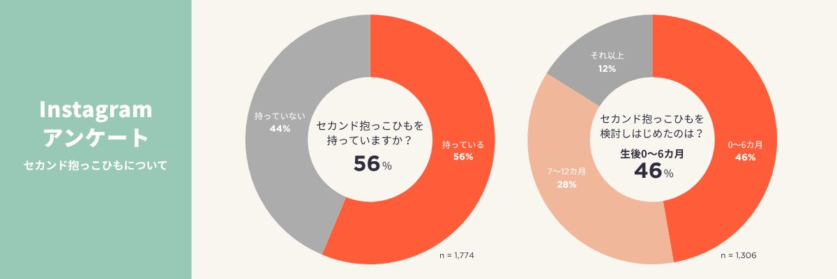 そんなときに活躍するのが、ヒップシートやスリングといった“セカンド抱っこひも”です。Instagramでアンケート※を実施したところ、約56%がセカンド抱っこひもをお持ちで、約46%が生後0~6カ月という早い段階で購入を検討しはじめたという回答でした。このことから、抱っこひもを使い分けることが、より快適な育児を実現する賢い選択として一般的になっていることがわかります。