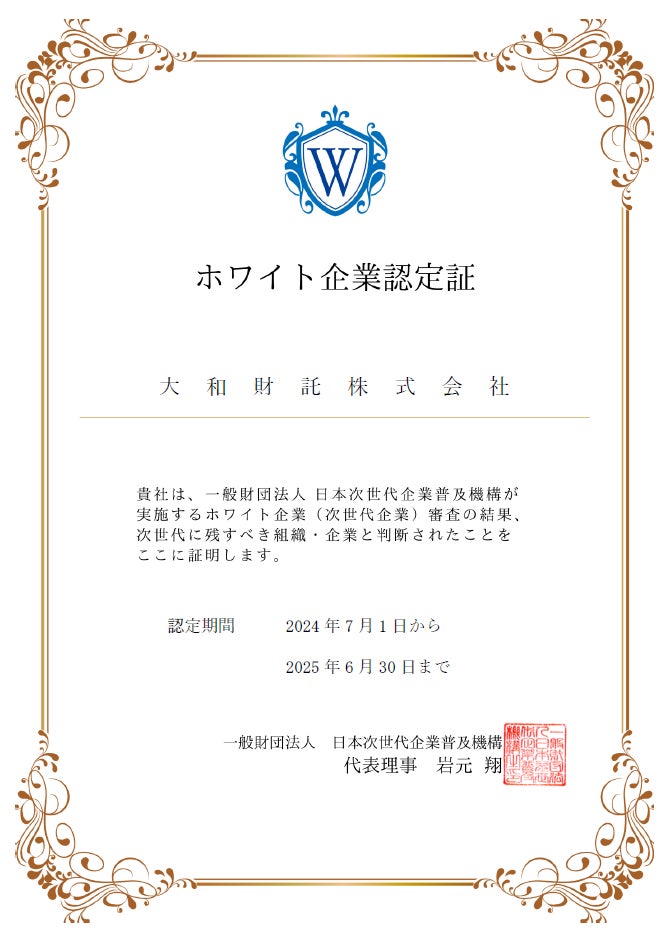 不動産・建築領域等を活用した資産価値共創事業を展開する大和財託株式会社(本社:東京都渋谷区/大阪府大阪市 代表取締役CEO:藤原正明、以下「当社」)は、一般財団法人日本次世代企業普及機構(以下、ホワイト財団)が認定する「ホワイト企業認定」において、当社初となる「プラチナ」認定を2024年7月25日(木)に取得しました。