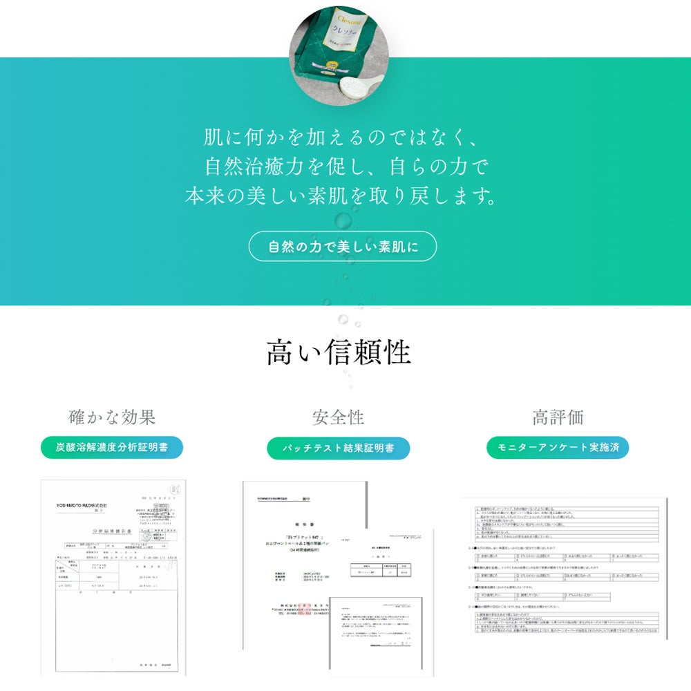 クレソナの新技術は、従来のムースやジェルでは保持できない1,400ppmの溶解濃度炭酸泉です。