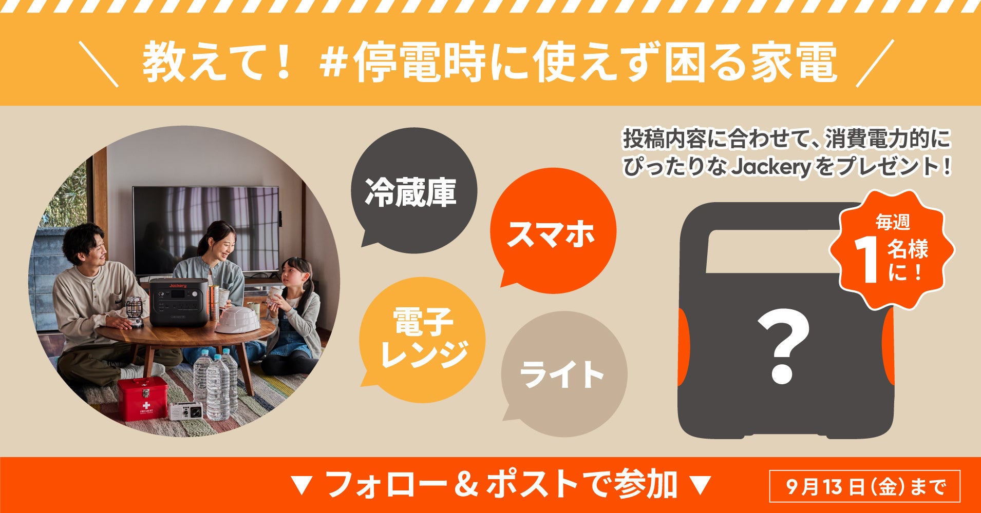 Jackery Japan公式Xアカウントでは、8月12日(月)~9月13日(金)の期間、抽選で毎週金曜日に、Jackeryポータブル電源があたる「教えて!#停電時に使えず困る家電」キャンペーンを実施中です。