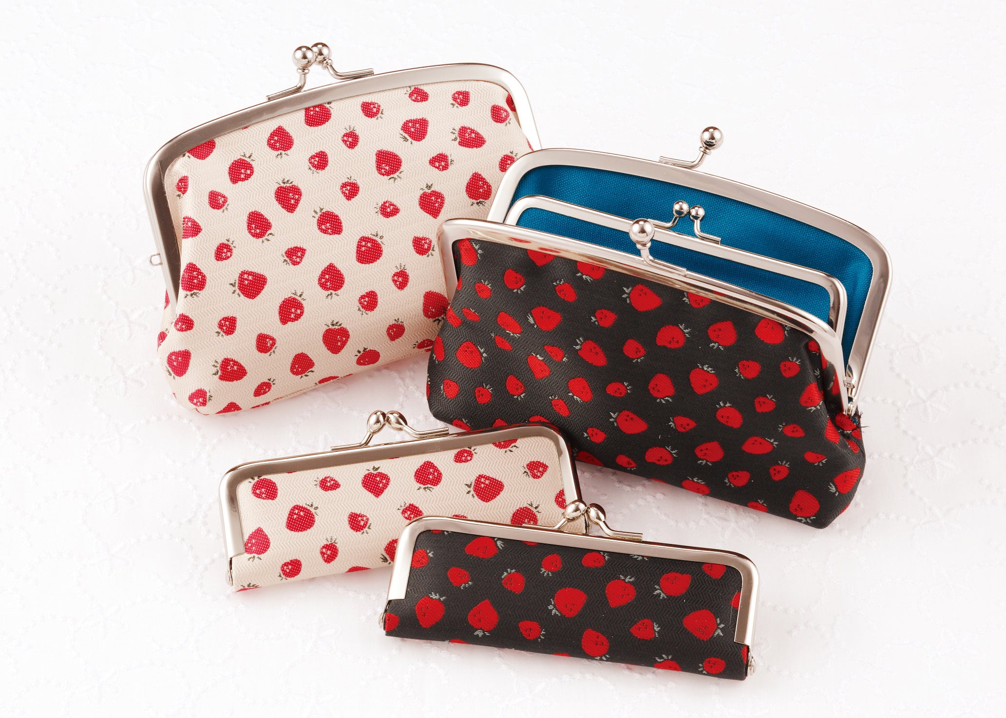 イチゴ柄がかわいいがま口。お財布にもぴったりな親子がま口や、印鑑ケースなどをご用意しています。