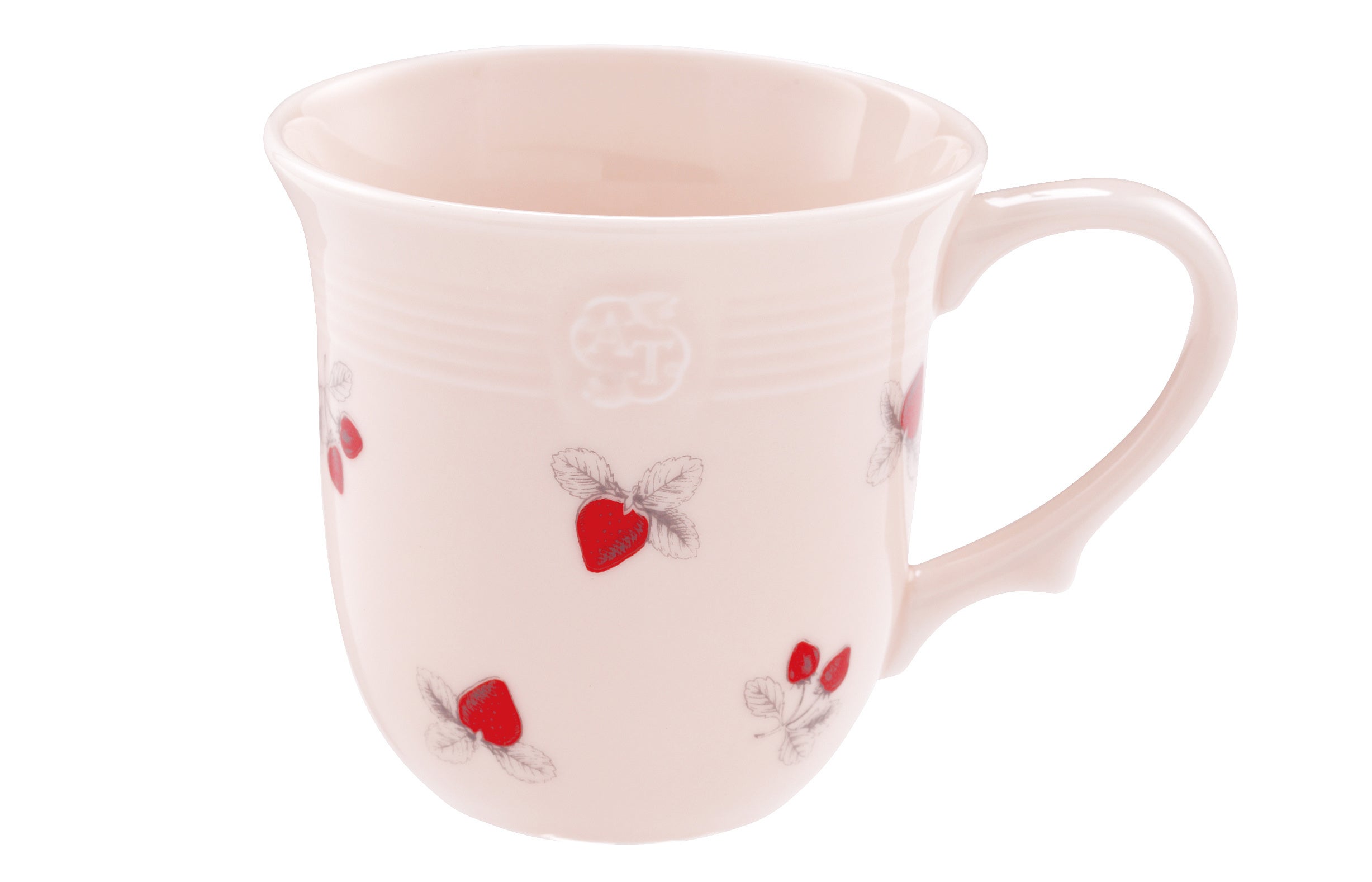 淡いピンクに大人っぽいイチゴの総柄が可愛いマグ。少し広がった口元は紅茶の香りを楽しめる設計です。