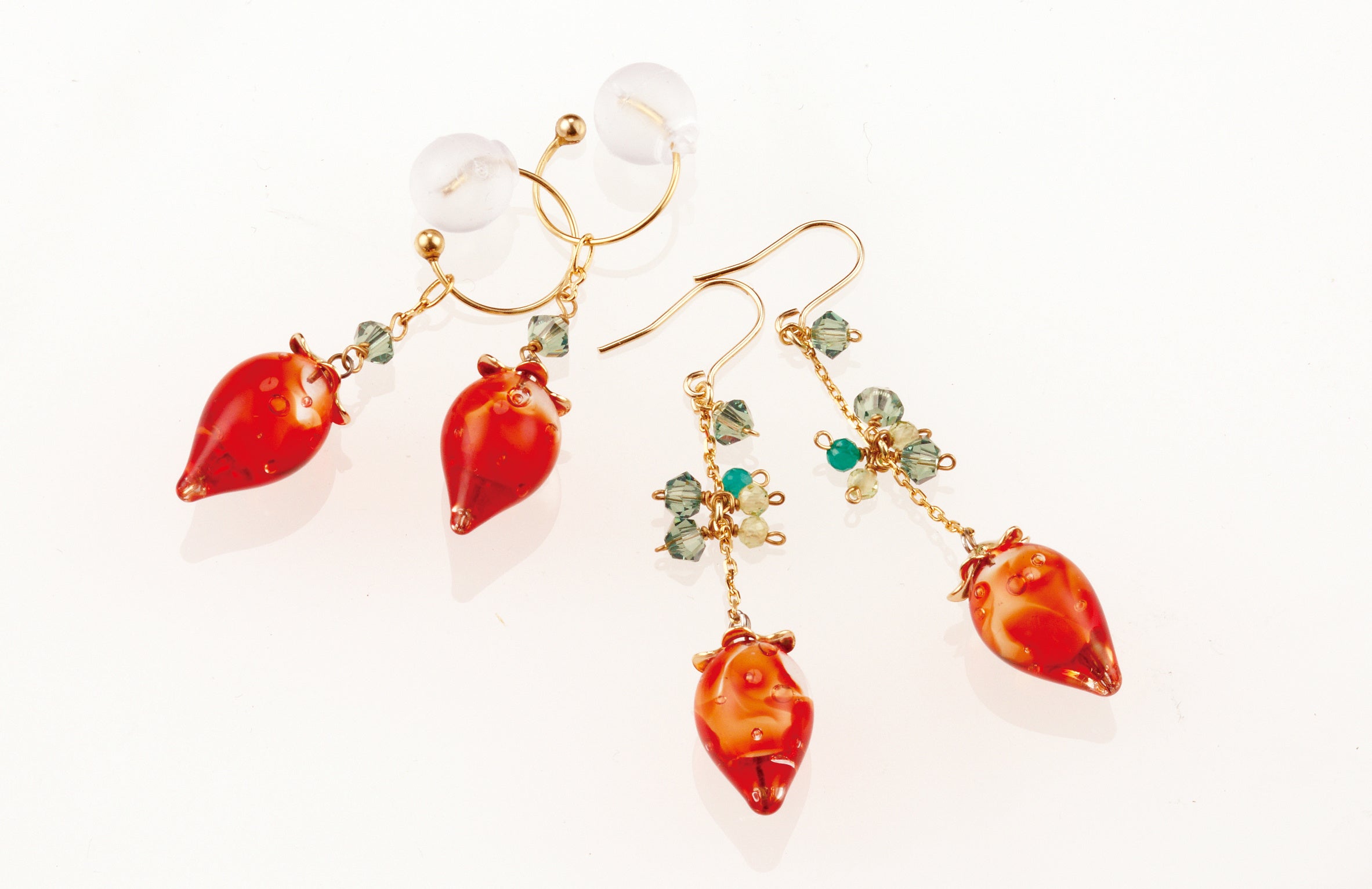 早摘みの様な甘酸っぱい色合いの苺に、グリーンの葉は鮮やかなスワロフスキーを添えて、揺れる苺そのものをイメージした手づくりのガラスアクセサリーです