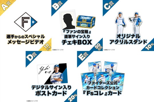 オンラインくじでは、総勢10名の選手の中からランダムで選手1名に名前を呼んでもらえる『スペシャルメッセージビデオ』や、同じく選手10名の『選手直筆サイン入りチェキ』など、豪華賞品をご用意しております。他にもここでしか手に入らない、2022シーズンの新ユニフォームを着用した選手の写真を使用した『アクリルスタンド』、さらにファイターズ公式カードコレクション「Fsコレ」のレアカードなど、いずれかの特典が当たるハズレなしのくじとなります。