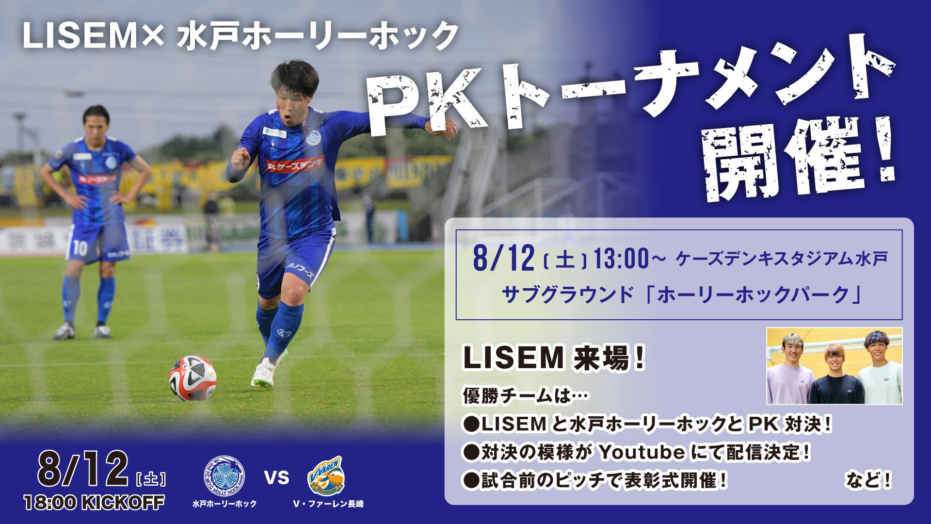 株式会社フットボールクラブ水戸ホーリーホック(代表取締役社長 小島耕/以下 水戸ホーリーホック)は、2023年8月12日(土)開催のホームゲームにて、サッカーYoutuber『LISEM』とのコラボレーション企画として、『LISEM×水戸ホーリーホック PKトーナメント』を開催することとなりましたので、下記の通りお知らせいたします。