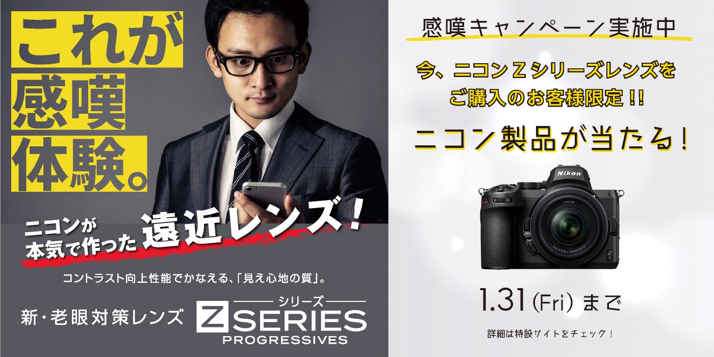メガネ・補聴器を販売する「メガネの愛眼」「Aigan」 ( https://www.aigan.co.jp/ )を運営する愛眼株式会社(本社:大阪市天王寺区、代表取締役社長:佐々 昌俊)は、株式会社ニコン・エシロールから発売された新作の遠近両用レンズ『Zシリーズ』を愛眼店舗で購入すると、ニコン製品が抽選で当たる【メガネの愛眼 ニコン感嘆キャンペーン】を2025年1月31日(金)まで全国のメガネの愛眼店舗で開催したことをお知らせします。
