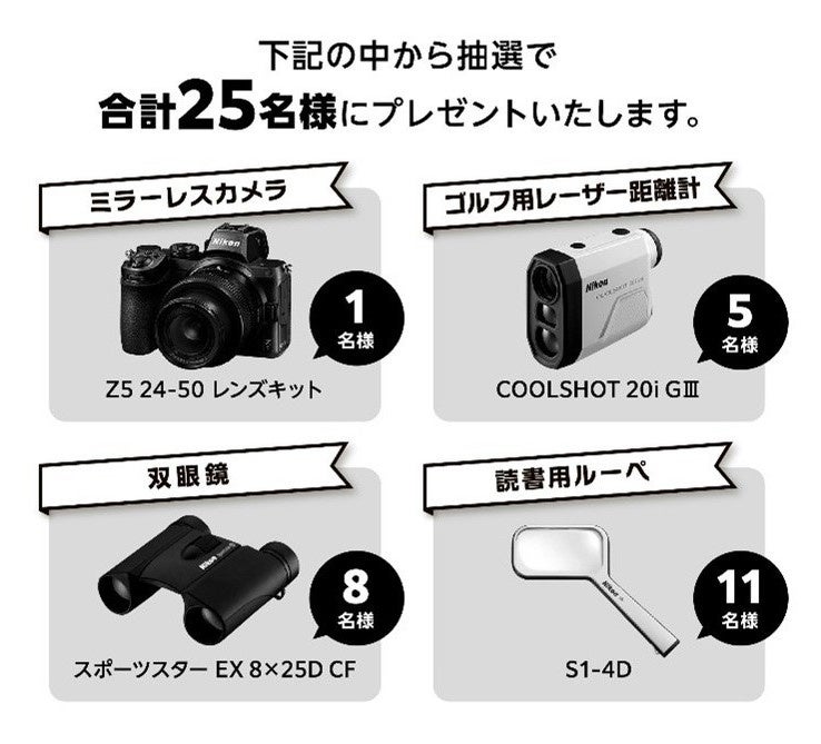 2024年12月6日(金)から全国のメガネの愛眼にて、ニコンの新作遠近両用レンズ『Zシリーズ』をご購入いただいた方を対象に、高品質で人気の高いニコン製品が抽選で当たるキャンペーンを実施いたします。