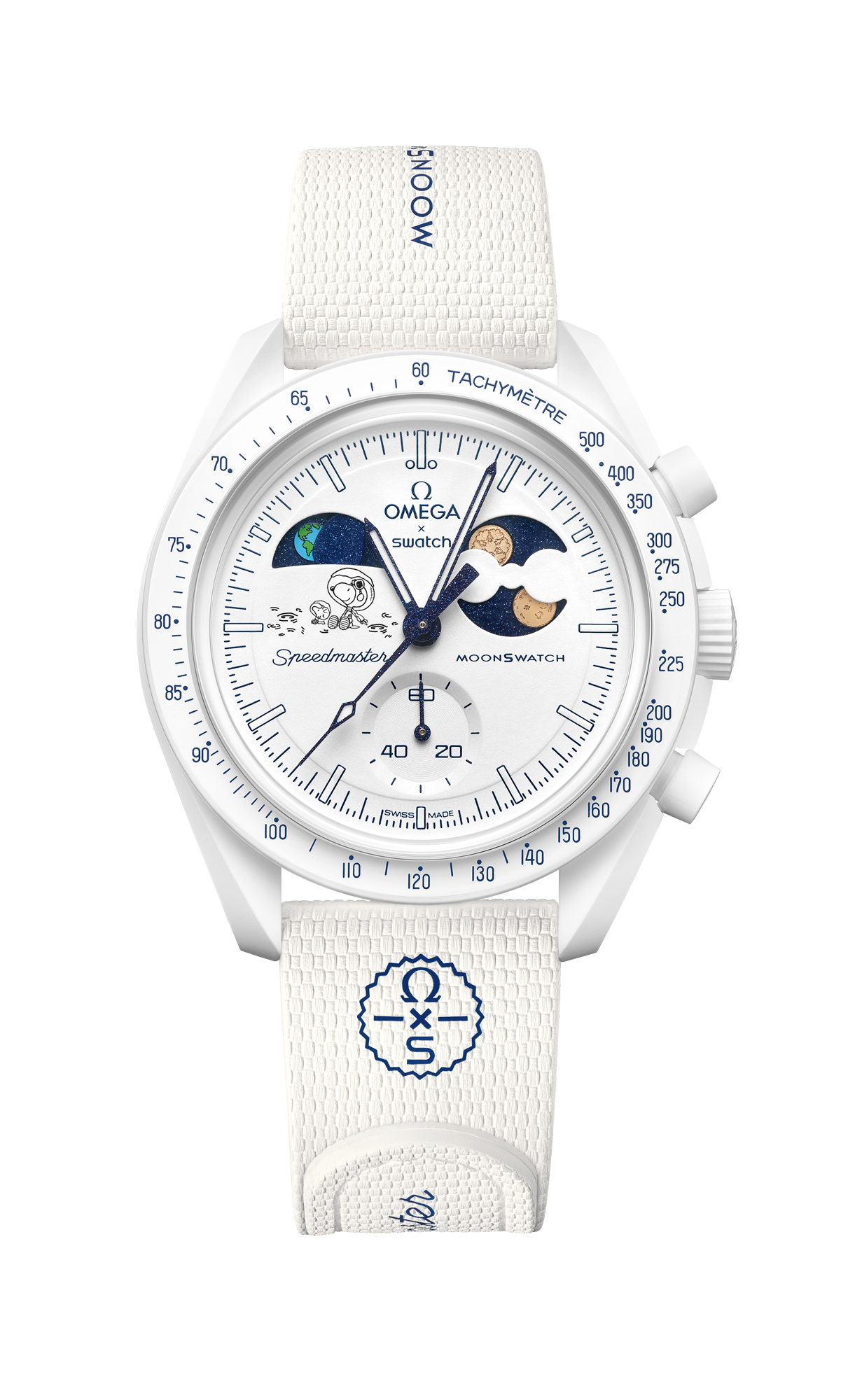 雪に覆われた冬景色を想わせるホワイトの色合いで作られたこの新作ウォッチは前作のモデルを忠実に再現した文字盤のレイアウトを継承し、Swatch のイノベーションであるアースフェイズ、OMEGA の Moonshine™ Gold をあしらったムーンフェイズ表示で仕上がっています。このモデルは9時位置にSnoopyワールドの独特のイラストを配置しつつ、今回は雪をテーマにしたアレンジで再解釈されています。