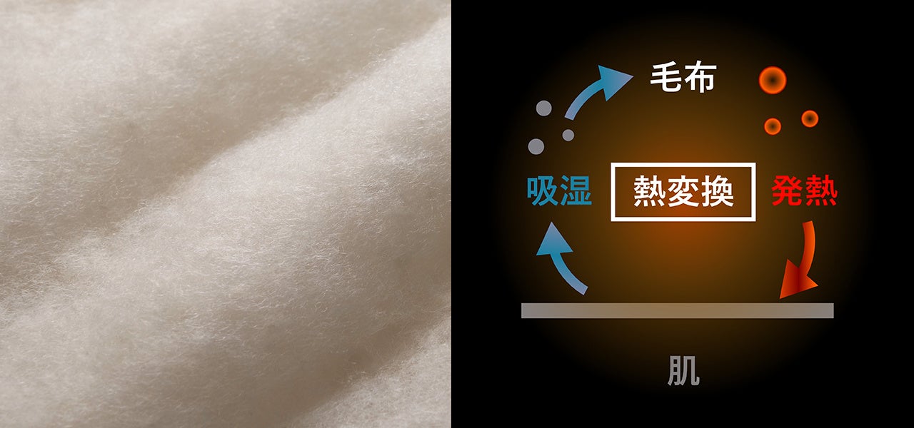 独自に開発した、湿気を吸って発熱する植物繊維【カポック】と保温性の高い【アクリル】、吸湿発熱性の高い【アクリレート】を中わたに使用しています。サステナブルな素材でありながら、吸った湿気を暖かな熱に変換する究極の発熱テクノロジー。