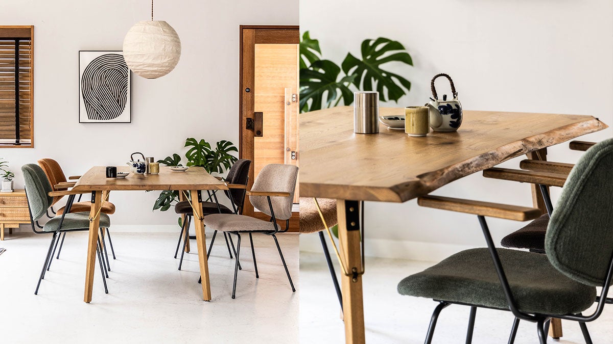 木の自然な表情を楽しめつつも、お部屋に調和する佇まいを大切にしました。従来のライブエッジテーブルが持つ「和」な印象を優しく中和し、ナチュラルテイストから北欧、ヴィンテージまで幅広いインテリアに溶け込むよう設計しました。さらに反りを防ぐ「ハギ板」(複数の木材を接着した構造)を採用し、美しさと長く使い続けられる実用性を両立させています。