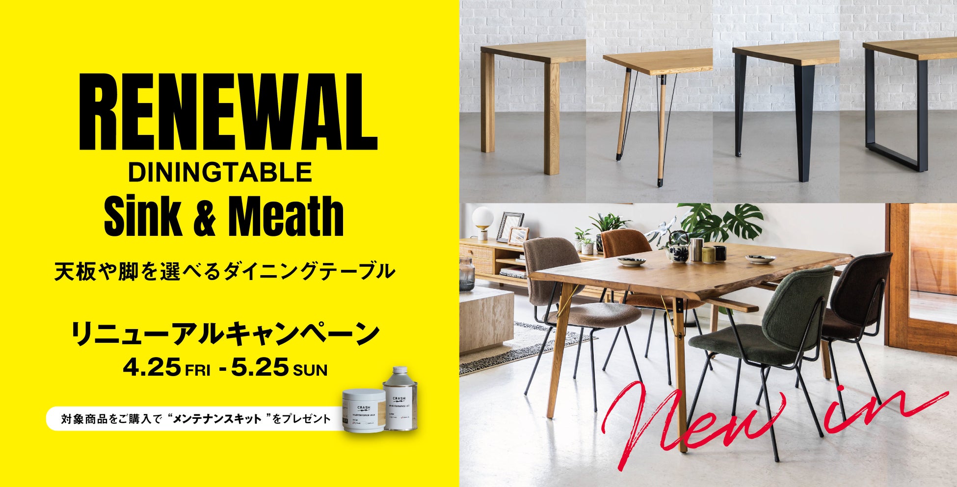 リニューアルを記念して、2025年4月25日(金)から5月25日(日)までの期間中、「シンク」または「ミース」をお買い上げのお客様に、大切なテーブルの美しさを長く保つための専用メンテナンスグッズをプレゼントさせていただきます。木の風合いを育て、経年変化を楽しんでいただけるアイテムです。数量限定となっておりますので、お早めにご検討ください。