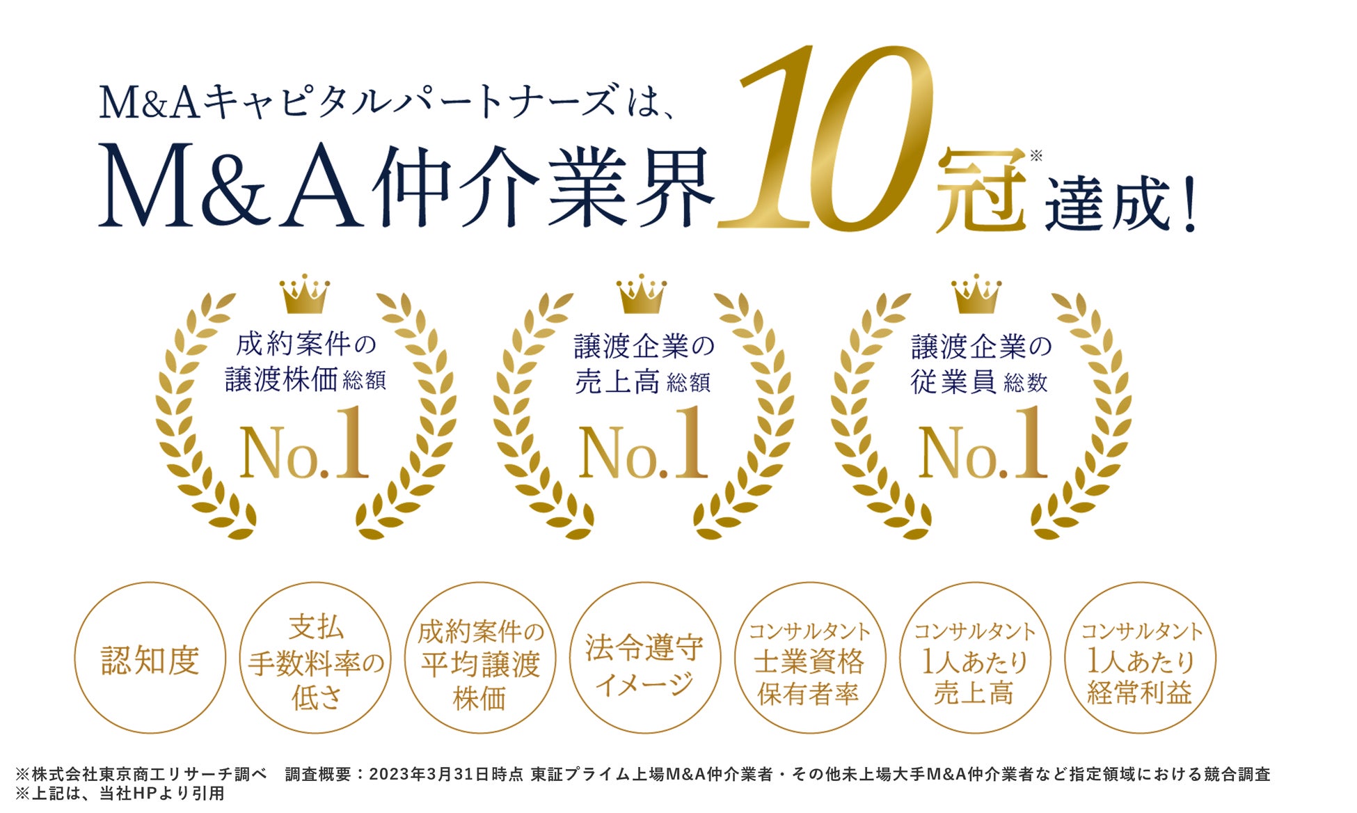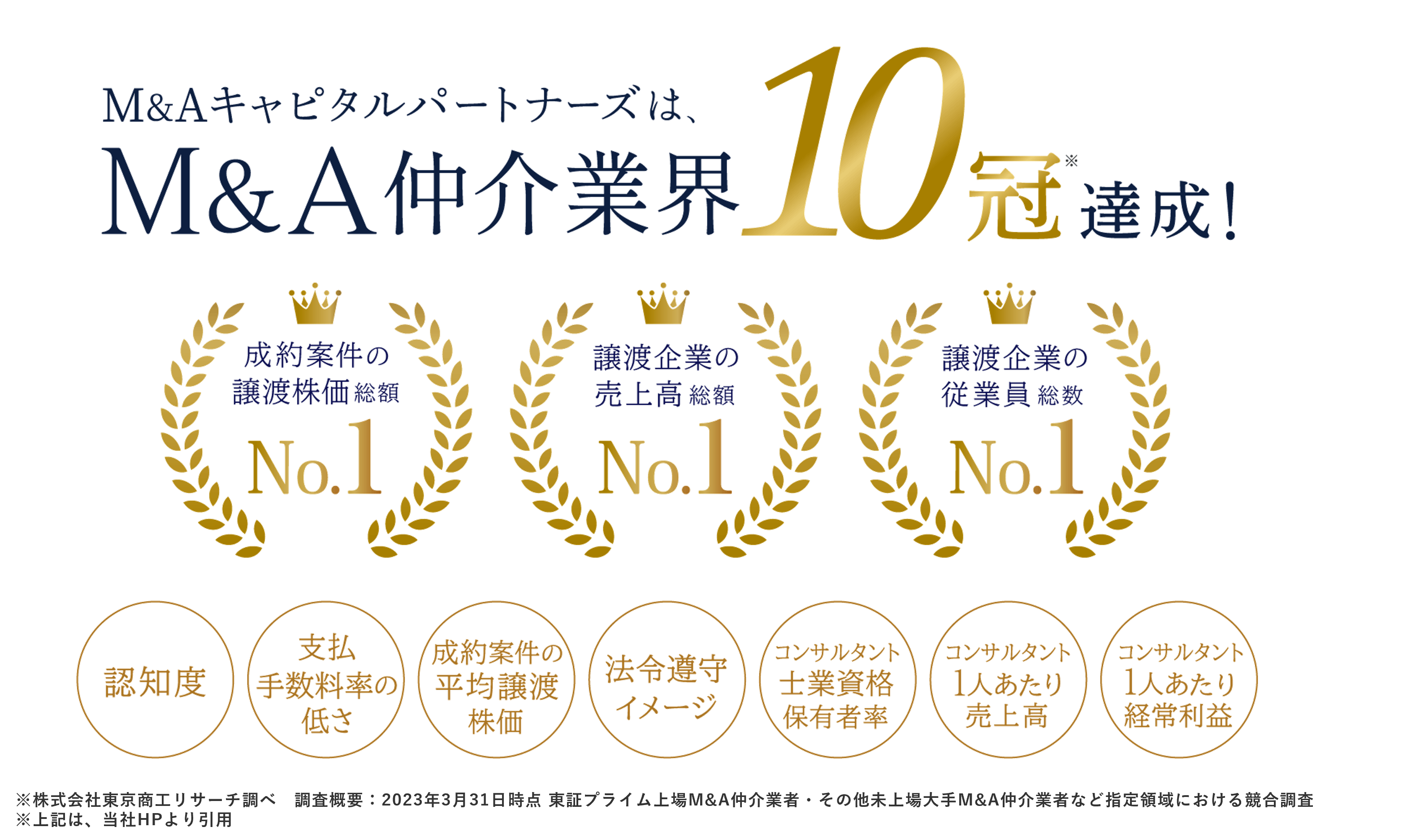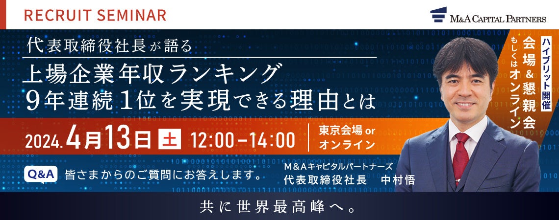 会社概要 社名:M&Aキャピタルパートナーズ株式会社(東証プライム上場 証券コード6080) 所在地:東京都中央区八重洲二丁目2番1号 東京ミッドタウン八重洲 八重洲セントラルタワー36階 代表者:代表取締役社長 中村 悟 設立:2005年10月 事業内容:M&A仲介事業 |