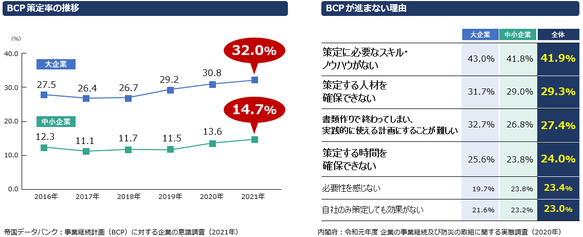 しかし、BCPの策定率は2021年時点で大企業が32.0%、中小企業が14.7%にとどまっており、さらに、BCPを策定している企業のうちでも、訓練を実施している企業は全体のわずか14.6%と、特に「運用・改善(ランニングフェーズ)」における取組みが進んでいない現状が明らかになっています※2。また、内閣府の調査によると「リスクを想定した経営が行えない理由」のトップが大企業・中小企業ともに「取り組み時間・人員(専門家含む)の不足」であるなど、計画策定の難しさや、継続的改善の負担が多くの企業で課題となっています※3。