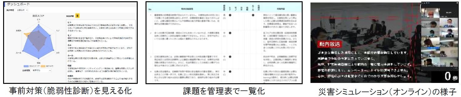 1500件を超える豊富なデータ(東日本大震災や新型コロナウイルス感染症、情報セキュリティ事故を含む過去の災害における被害状況や企業の対応行動)の集積によるベンチマークとデジタルツールの活用により、会員企業の災害に対する脆弱性の診断と、「事前」対策として取り組むべき課題を見える化します。また、オンラインで行う災害シミュレーションを通じて、「事後」対応力強化として取り組むべき課題を明らかにします。
