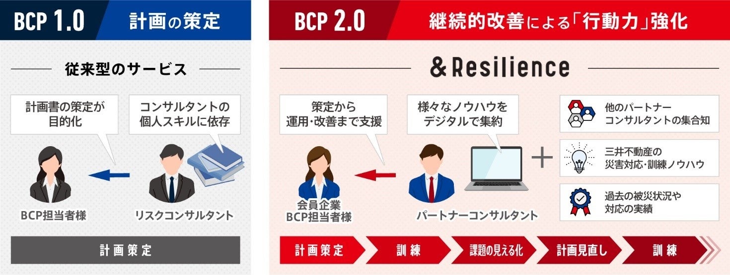 「&Resilience」では、取り組みの目的を「文書の作成」から「災害時の行動力強化(“BCP2.0”)」へシフト。BCP策定後の「運用・改善」にフォーカスし、これまで非効率な業務だった「課題の見える化、行動計画の策定・見直し、確認訓練」というマネジメントサイクルをデジタルの活用を通じて効率化し、専門的な知見・ノウハウを持つパートナーコンサルタントが持続的な改善活動をサポートする日本初※1の会員制サービスを提供することとしました。