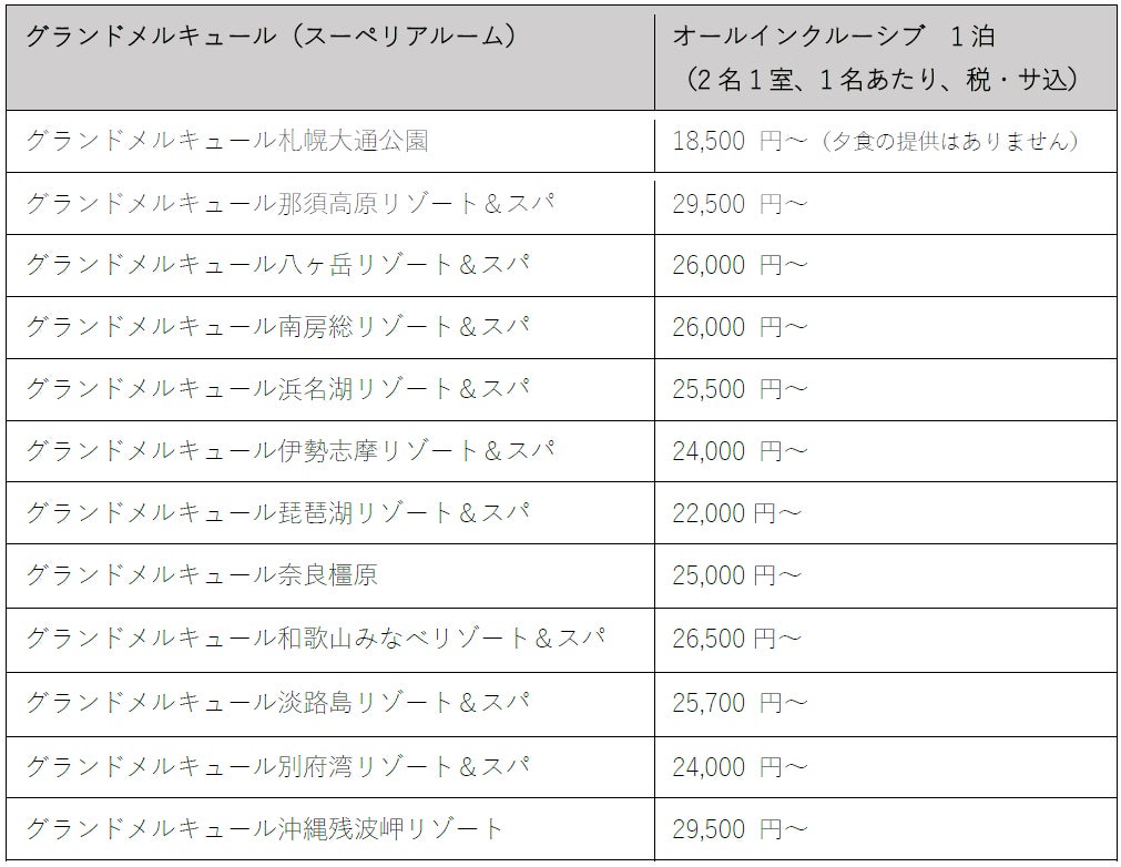 *2 グランドメルキュール沖縄残波岬リゾート、メルキュール佐賀唐津リゾートは温泉ではありません。また、グランドメルキュール札幌大通公園は、大浴場がありません。