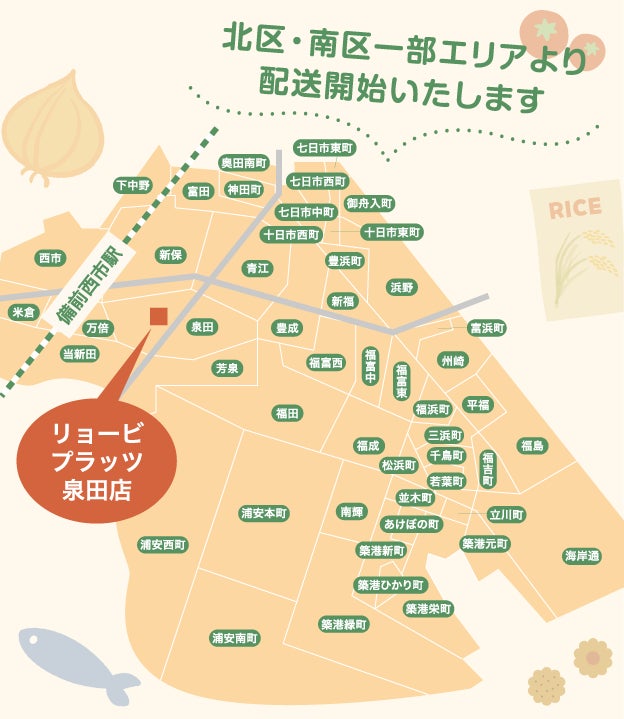 岡山市内のリョービプラッツ泉田店を拠点とする北区及び南区の一部エリアが対象で、 10月4日(水)より配送開始。両備ストアの目利きバイヤーが厳選した生鮮商品も鮮度を保ってお届けします。