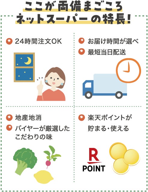 両備まごころネットスーパーのご利用には「楽天会員登録」と「楽天全国スーパー利用登録」が必要です。また、エリア限定サービスとなりますので、ご登録時に配送可能エリアをご確認ください。