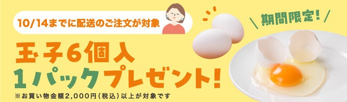 2023年10月1日(日)~2023年10月14日(土)のお届け分について、1注文あたりのお買い物金額2,000円(税込)以上で、対象のたまごを1パックプレゼントします。