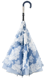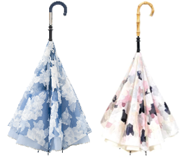 傘が自立するので両手を使いたいときに地面に置くことができたり、一般的な傘と逆の開き方をするため、車の乗り降りの際にも便利です。特殊な傘の骨を2 枚の傘生地で挟みこんでおり、生地の色合わせによってさまざまなデザインバリエーションを展開しています。