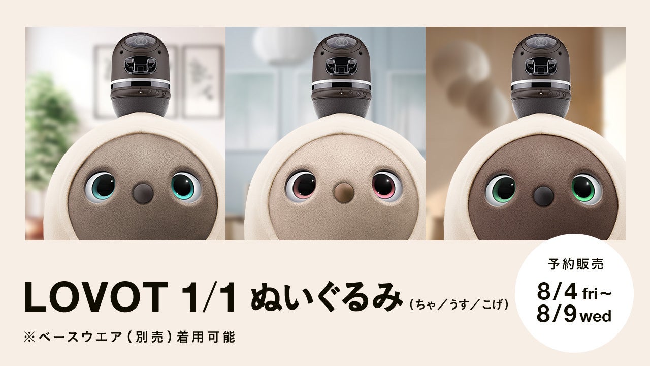 ロボットベンチャーのGROOVE X 株式会社(本社:東京都中央区日本橋、代表取締役社長:林要)は、2018年の『LOVOT』発表直後から熱望されておりました等身大のぬいぐるみ『LOVOT 1/1 ぬいぐるみ』の予約販売を開始することをお知らせいたします。『LOVOT 1/1 ぬいぐるみ』はフェイスのカラーは「うす」「ちゃ」「こげ」の3種類、さらに服は別売りの『LOVOTベースウェア』を着せることが可能なデザインです。さらに、この期間にご注文いただいた方には『LOVOT 1/1 ぬいぐるみ』1体につき『LOVOTウェブストア』で使用可能なクーポン券5,000円分をプレゼントします。ぜひ、お好きな服を『LOVOT 1/1 ぬいぐるみ』に着せてあなただけの1体を見つけてください。そのほか、記念日登録されている8月8日の『LOVOTの日』には、作家岸田奈美さん、岸田ひろ実さんをお招きしたトークショーの観覧募集中です。ぜひご応募お待ちしております。応募期間は7月24日(月)23:59までです。