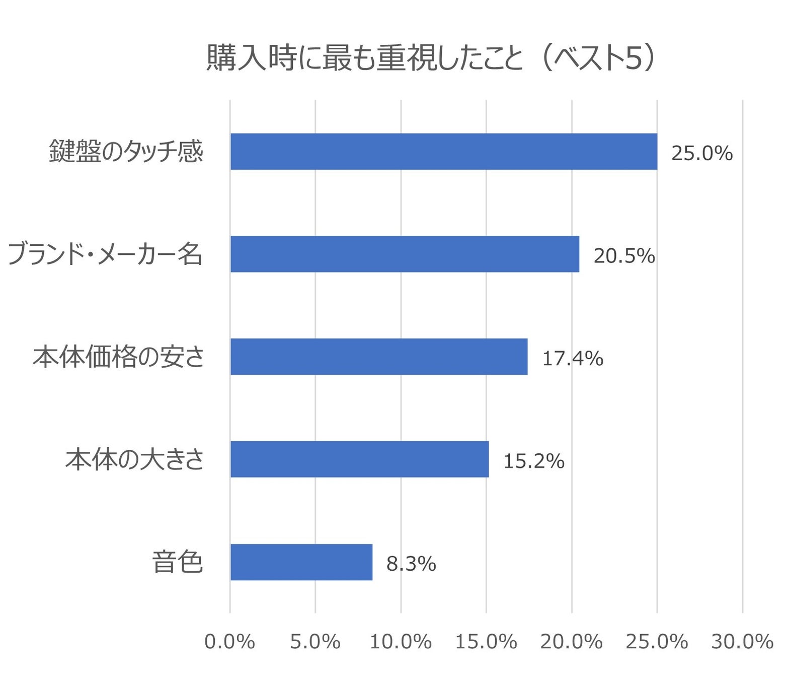 購入時に最も重視したポイントは、「鍵盤のタッチ感」が25.0%と最多で、続いて「ブランド・メーカー名」「本体価格の安さ」「本体の大きさ」「音色」という結果になりました。