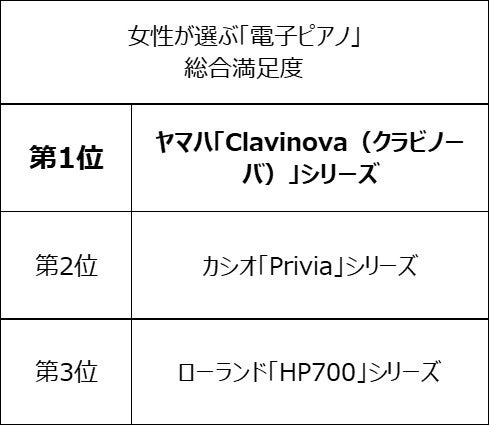 2022年8月に実施した調査において、「カシオ/Priviaシリーズ」が女性が選ぶ「電子ピアノ」利用率、価格満足度第1位、「ローランド/HP700シリーズ」は機能満足度第1位、 「ヤマハ/Clavinova(クラビノーバ)シリーズ」は総合満足度第1位(同商品はリピート率も第1位)を受賞しました。