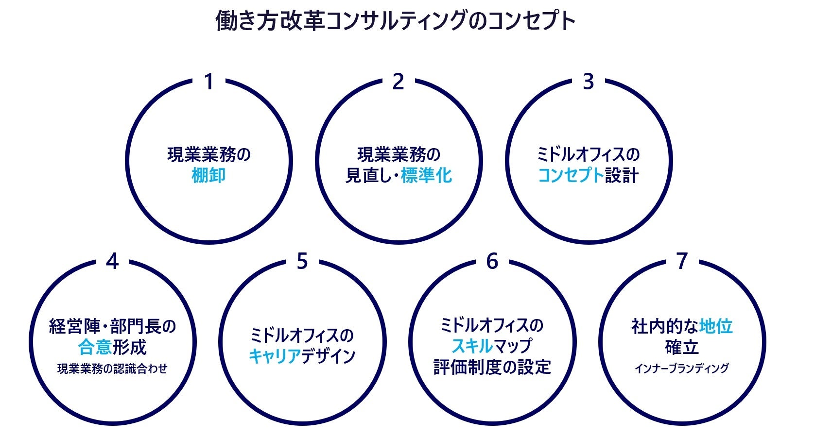 本コンサルティングでは、現場をサポートするミドルオフィスを、自社の現状に即した形で組織として組み立て、現実的な成長STEPを構築します。そして、各段階において適切な分業化を図ることで、現場の生産性向上と働き方改革の推進に繋げます。
