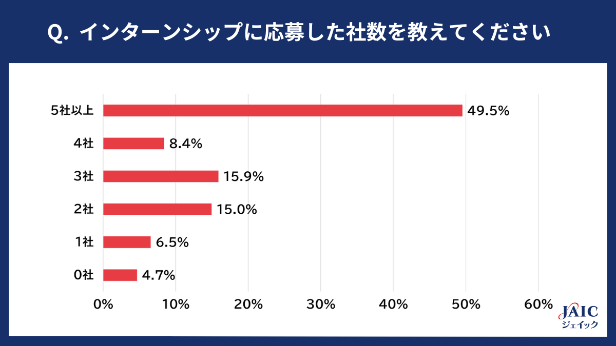 「インターンシップに応募したことのある社数を教えてください」と質問したところ、「5社以上」が49.5%、「4社」が8.4%「3社」が15.9%、「2社」が15.0%、「1社」が6.5%、「0社」が4.7%となりました。