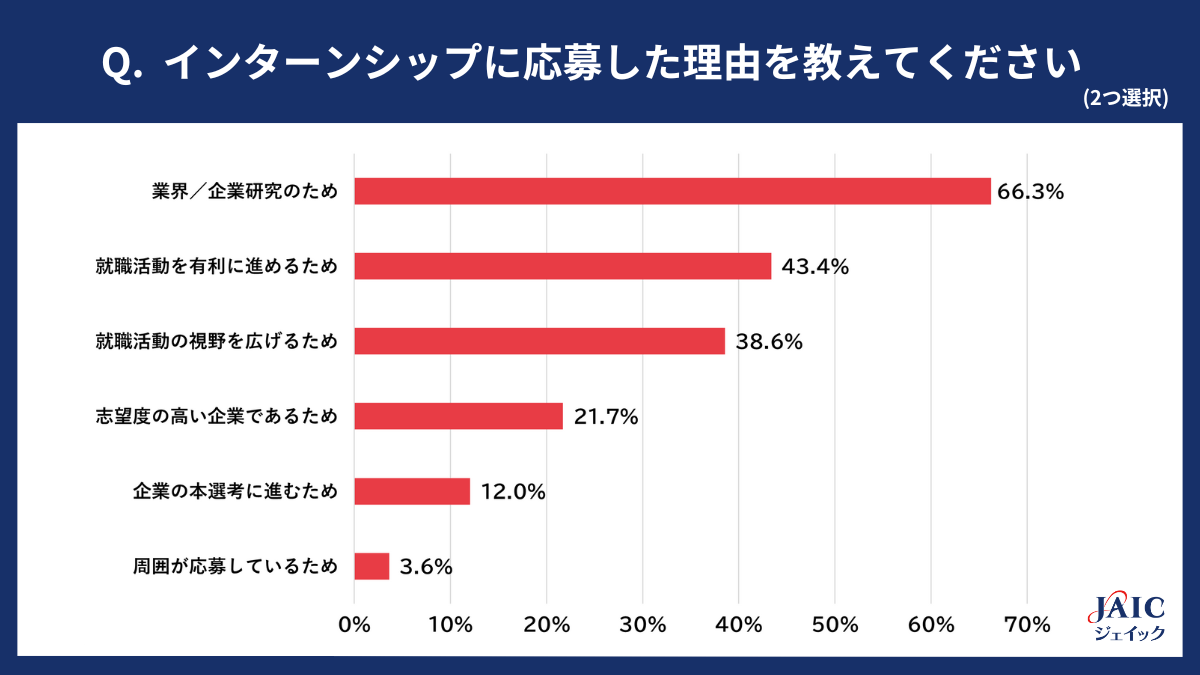 「インターンシップに応募した理由として、あてはまるものを2つ選択してください」と質問したところ、「業界/企業研究のため」が66.3%と最多、次いで「就職活動を有利に進めるため」が43.4%、「就職活動の視野を広げるため」が38.6%という結果になりました。
