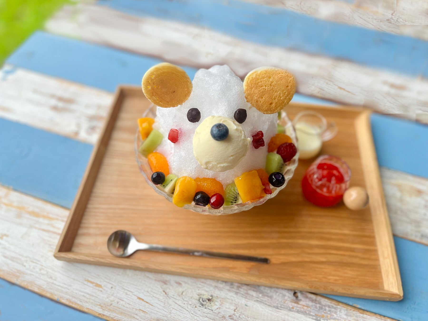 真っ白なかき氷の上にぱんケーキやバニラアイス、フルーツをのせる体験型のかき氷です。可愛いオリジナルしろくまのかき氷に、いちごシロップや練乳をお好みでトッピングしてお楽しみいただけます。