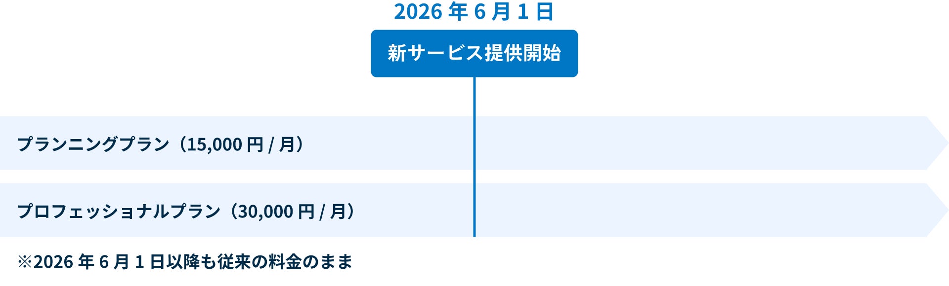 2026年5月31日までに「プランニングプラン」および「プロフェッショナルプラン」を契約した場合、2026年6月1日以降も、本改定に伴う変更はなく、 改定前の契約内容・利用料金のまま、サービス利用が可能です。2026年6月1日以降に契約プランの変更を行う場合は、新プラン(新価格)での契約となります。
