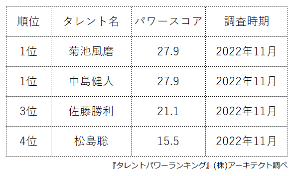 本ランキングは、2022年11月度に実施したタレント調査データ(一部過去実施データ)を利用し、タイトルに応じてランキング形式でまとめたものです。