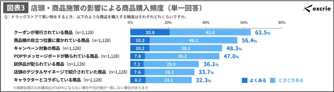 店頭・商品施策の影響による商品購入頻度を聴取したところ、「クーポンが発行されている商品」を購入することが「ある(よくある+ときどきある)」と回答した人は63.5%と、他施策より高い結果となりました。(図表3)