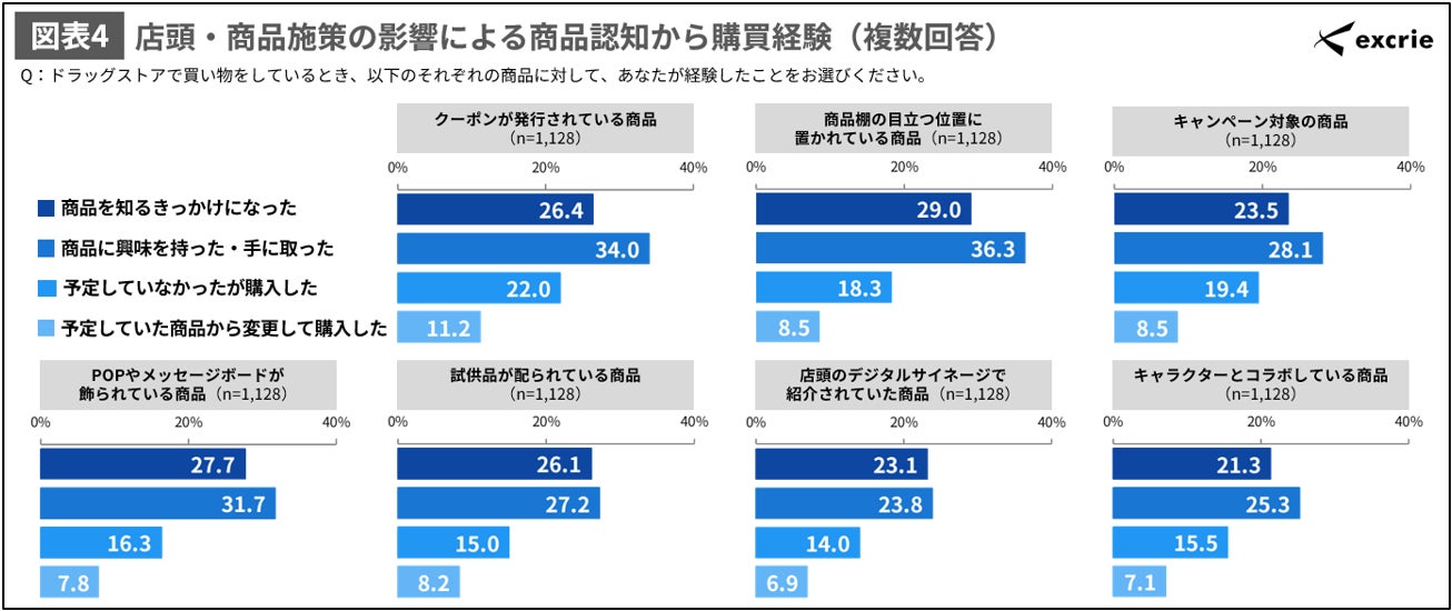 株式会社クロス・マーケティンググループのグループ会社でソーシャル&セールスプロモーションサービスを展開する株式会社エクスクリエ(本社:東京都新宿区、代表取締役社長:小笠原 亨)は、ドラッグストアを週1回以上利用している全国15歳~69歳男女(1,128人)を対象に「ドラッグストアにおける店頭・商品施策の購買影響調査(2026年)」をWebアンケートにて2026年3月16日(月)~ 23日(月)に実施しました。