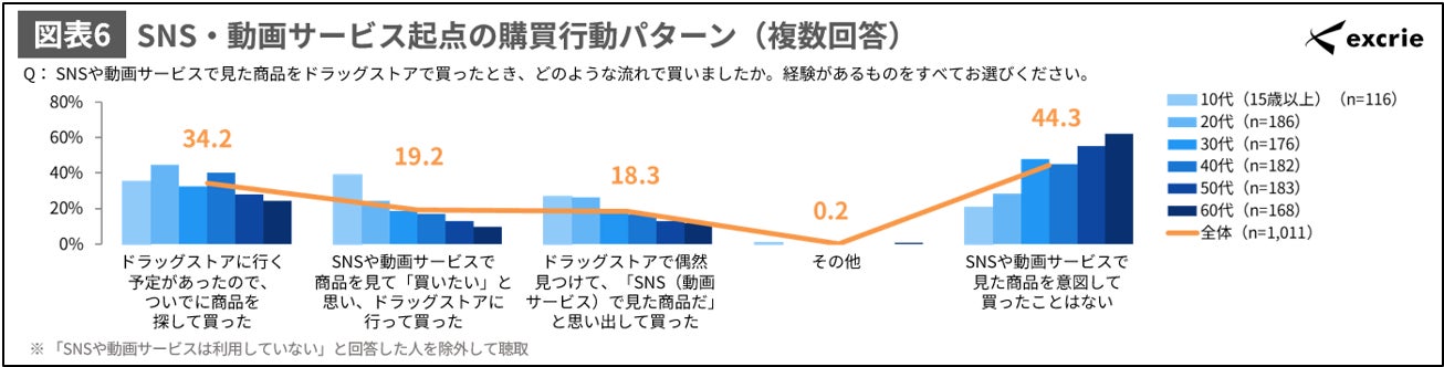 SNSや動画サービスで見た商品の購買行動パターンを聴取したところ、「SNSや動画サービスで見た商品を意図して買ったことはない」が44.3%であり、年代が上がるほど割合が高くなりました。一方、「SNSや動画サービスで商品を見て『買いたい』と思い、ドラッグストアに行って買った」の割合は若年層ほど高くなっています。(図表6)