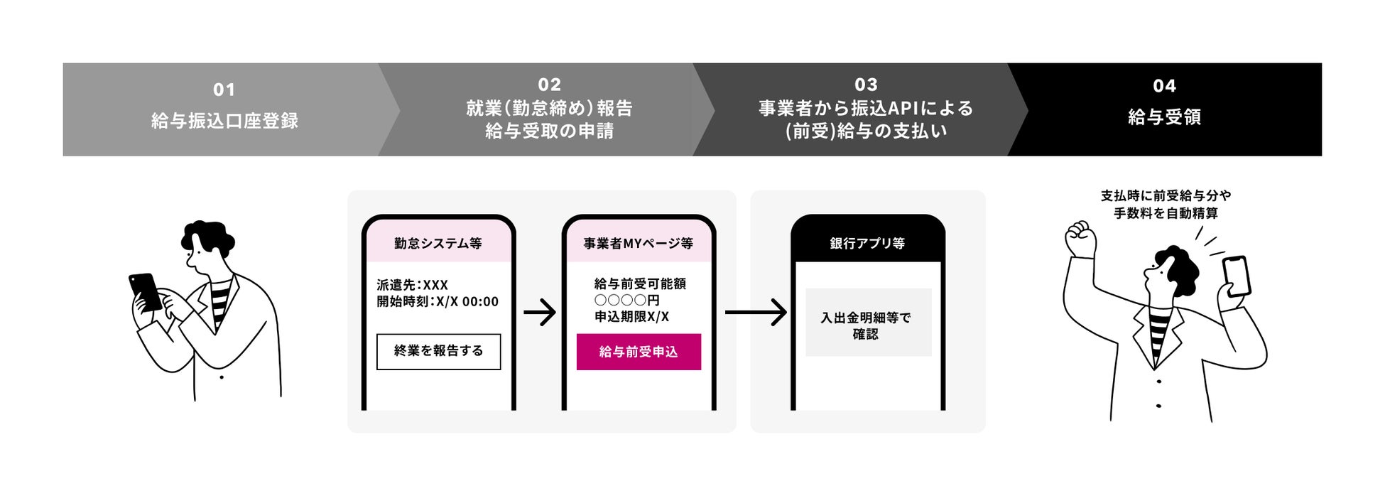 株式会社みんなの銀行(取締役頭取 永吉 健一、以下「みんなの銀行」)が更新系APIを提供したパーソルテンプスタッフ株式会社(代表取締役社長 木村 和成、以下「パーソルテンプスタッフ」)の「給与前受け取りサービス」が、2025年4月1日より提供開始になりました。給与前受け取りサービスは、パーソルテンプスタッフをはじめとするパーソルグループ5社*¹で就業中の派遣スタッフ等が、給与の一部を給与支給日前に受け取ることができるサービスです。従来のサービスと比べて、簡単且つ低コストで利用できるようになります。
