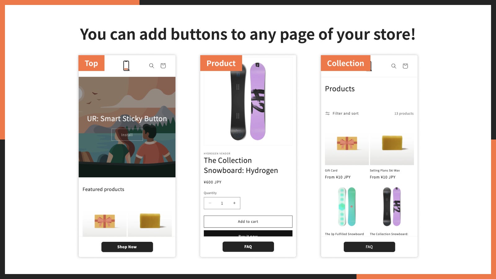 ホームページ、商品ページ、コレクションページなど、ストアのあらゆるページに追従ボタンを設置可能。ページごとに異なるボタンを配置することもできます。商品ページでは「カートに追加」ボタン、ブログページでは「メルマガ登録」ボタン、コレクションページでは「絞り込み検索」ボタンなど、各ページの目的に応じた最適なボタンを表示。さらに、特定のページや商品カテゴリーごとに表示・非表示を細かく制御できるため、ユーザー体験を損なうことなく、効果的な導線設計が可能です。