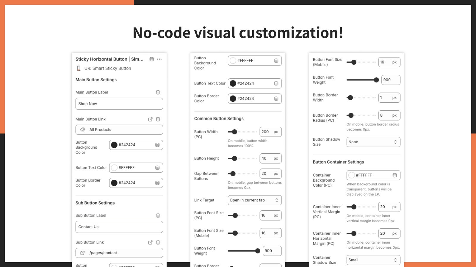 ボタンの色、サイズ、テキスト、アイコンを自由にカスタマイズ。ストアのブランドイメージに完璧にマッチするボタンを作成できます。背景色、文字色、ボーダー、角丸の調整はもちろん、ホバー時のアニメーション効果も設定可能。さらに、デバイスごとに異なるサイズや位置を設定できるレスポンシブデザインにも対応。