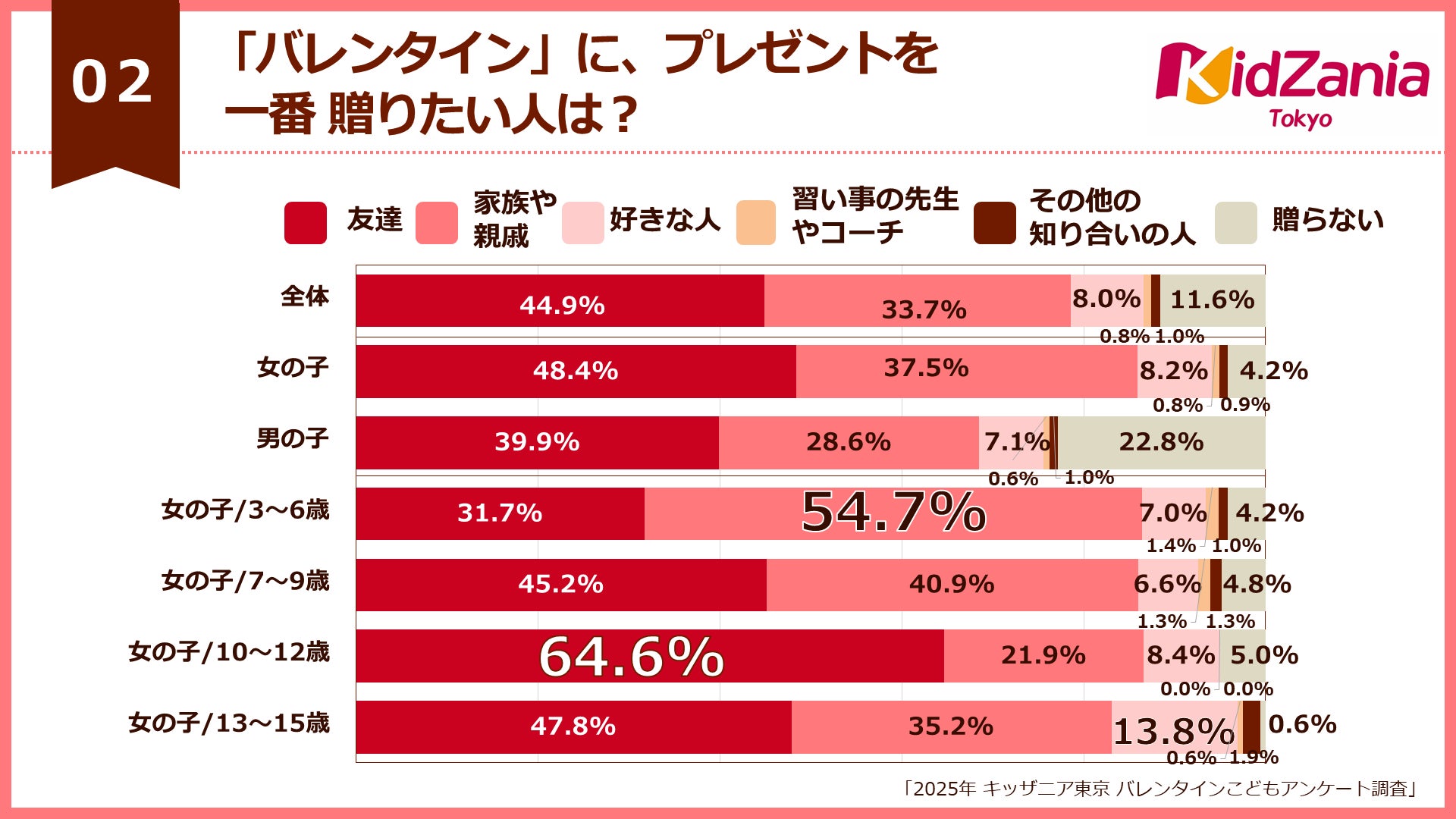 また、3~6歳の女の子は、54.7%が一番贈りたい相手として「家族や親戚」を選んでおり、他の年代と比べても非常に高い結果となりました。