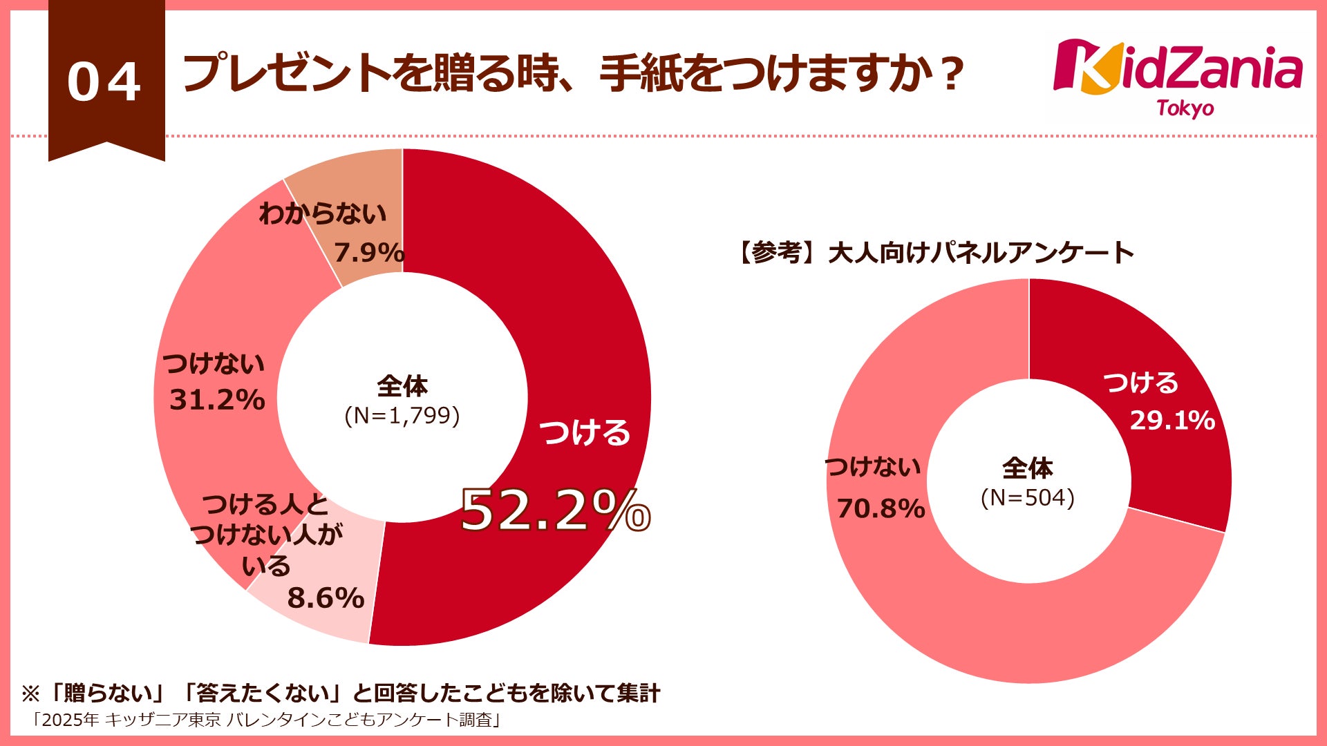 一方、大人向けアンケートでは「手紙をつけない」の回答が70.8%、「手紙をつける」の回答が29.1%でした。