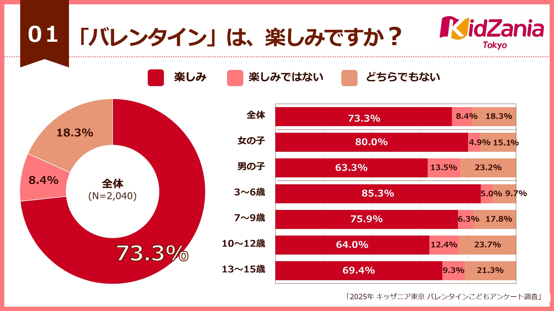 こどもの職業・社会体験施設「キッザニア東京」(東京都江東区)は、こども自身がこども達のバレンタインに関する意識調査を行う期間限定イベント「バレンタインこどもアンケート調査」(以下、本イベント)を、2025年1月17日(金)~1月27日(月)の期間で実施し、2,040人から回答を得て、その調査結果を2月4日(火)に発表しました。