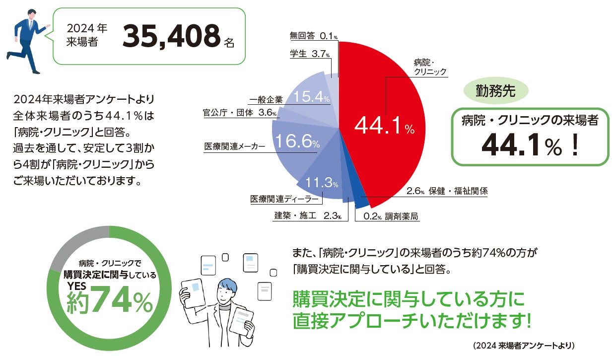 毎年「病院・クリニック」からの来場者のうち多くの方が、「購買決定に関与している」と回答しています。