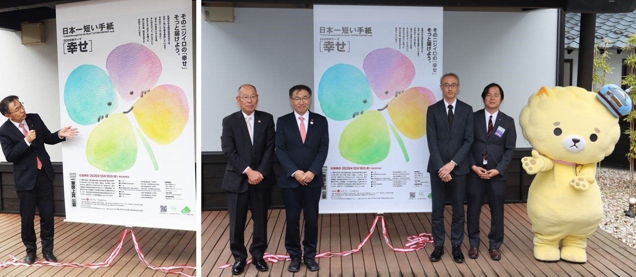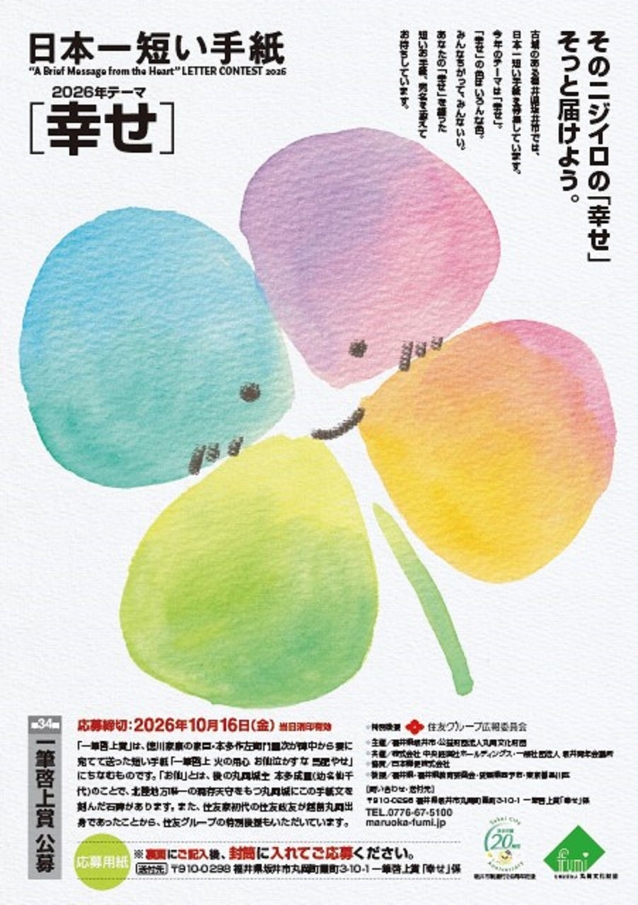 日本一短い手紙のコンクールで知られる一筆啓上賞の第34回(2026年度)テーマが「幸せ」に決まった。主催の福井県坂井市と丸岡文化財団が4月7日、同市丸岡町にある「手紙の館」で記者会見し、発表した。「幸せ」のテーマは、過去になく初めて。10月16日まで作品を募集している。