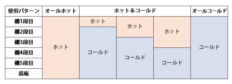 HOT(温蔵)時は55±5℃とCOLD(冷蔵)時は5~10℃の切替式。季節に合わせた陳列が可能です。
