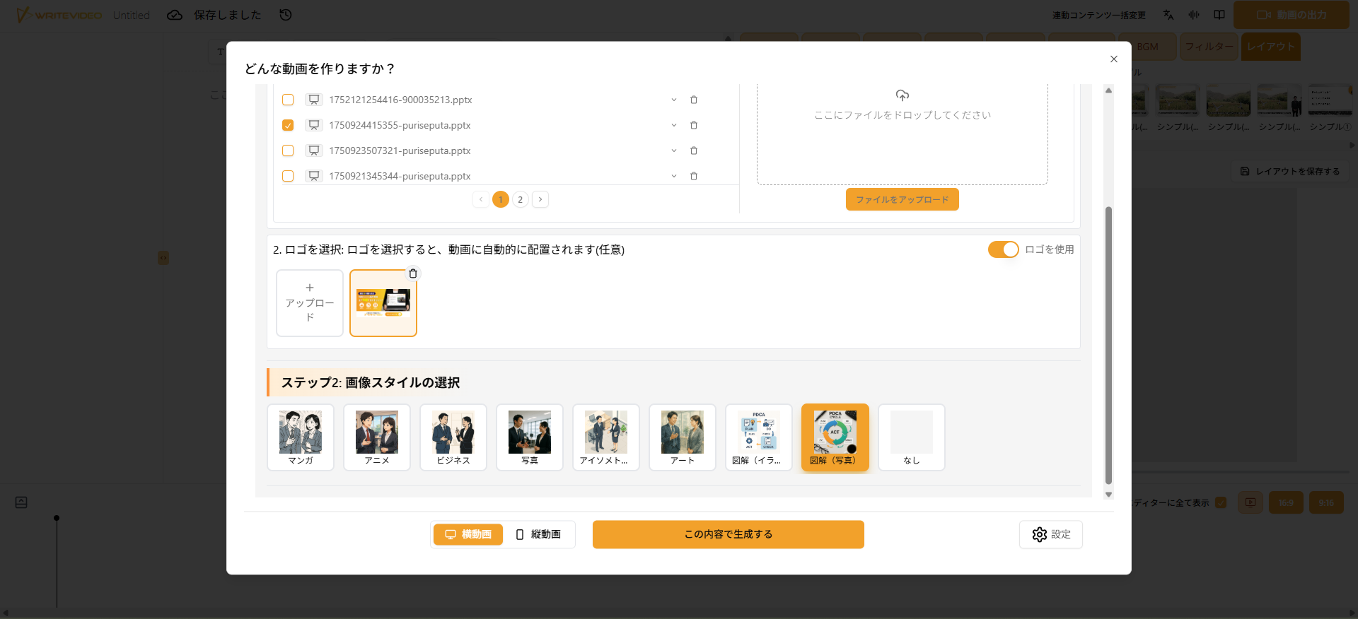 参考PPTXの選択後、「2. ロゴを選択」の項目からロゴ設定を行えます。ロゴは任意で、[ロゴを使用]をオンにすると、指定したロゴが動画内に自動的に配置されます。社内研修や顧客向け資料など、配布先に合わせてブランド表記を揃えたい場合に活用できます。
