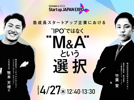 当社の連結子会社である株式会社日本M&Aセンター(以下、日本M&Aセンター / 本社:東京都千代田区 / 代表取締役社長:三宅 卓 / URL:https://www.nihon-ma.co.jp/)は、2023年4月27日から29日まで東京ビッグサイトで開催のスタートアップ向け展示会「Climbers Startup JAPAN EXPO 2023」に出展いたします。27日には日本M&AセンターがM&Aを支援した株式会社バーチャルレストラン(USEN-NEXT GROUP)の牧本 天増代表取締役社長と当社社員が「急成長スタートアップ企業における“IPO”ではなく“M&A”という選択」をテーマに講演します。