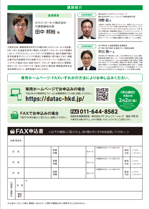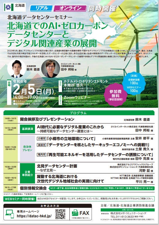 本セミナーでは、国内外の視点を踏まえ、今後の北海道におけるAI・ゼロカーボンデータセンターの展開や多様なデジタル関連産業の集積に向けた可能性などについて、ご紹介します。